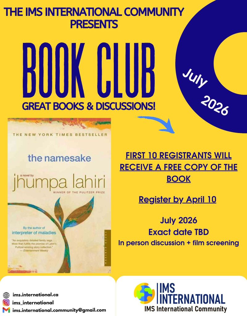 Join the IMS International Community Book Club 📖📚. This session, we will be reading and discussing The Namesake by Jhumpa Lahiri, a novel exploring identity, migration, and belonging.